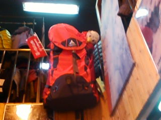 店内の巨大なVAUDEのザックに小谷村のキャラクター タリタリが遊びに来てますので見つけて下さいねー!!白馬のキャラクターって何だっけ!?